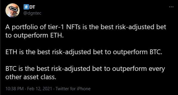 Tier-1 NFTs, denominated in ETH, should outperform ETH itself as the Ethereum economy grows — mainly from DeFi at the moment. Their scarcity makes them the true SOV once you’re crypto native.
